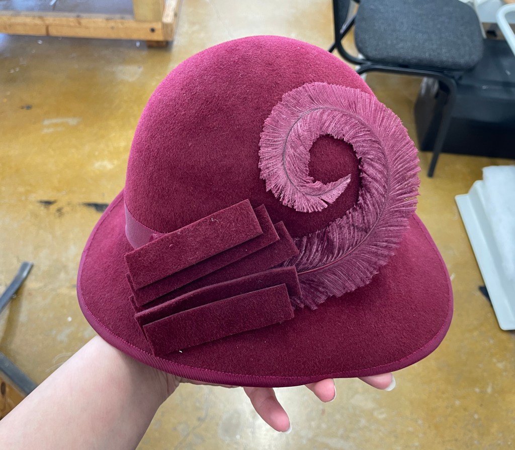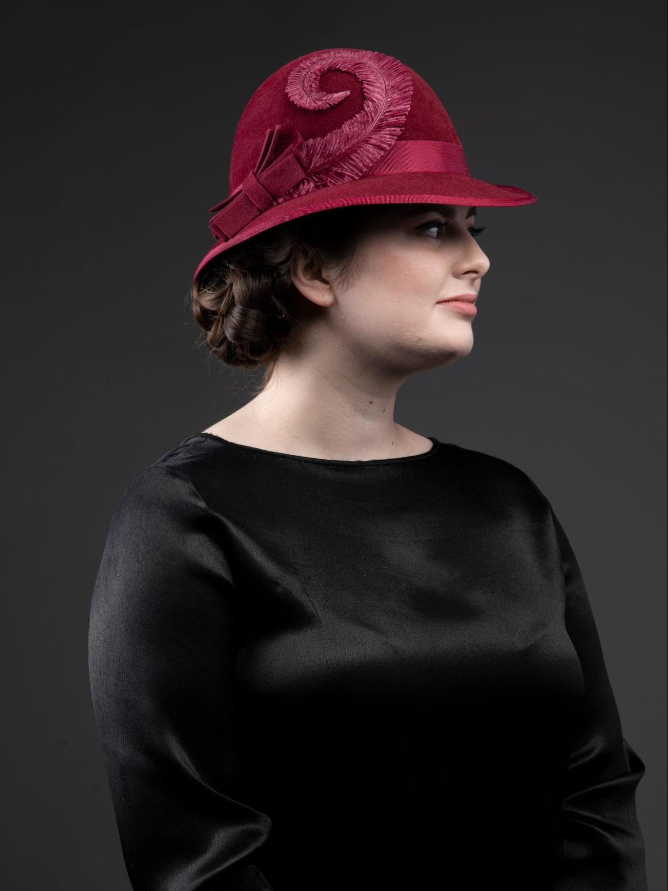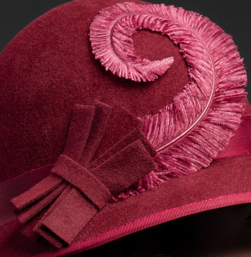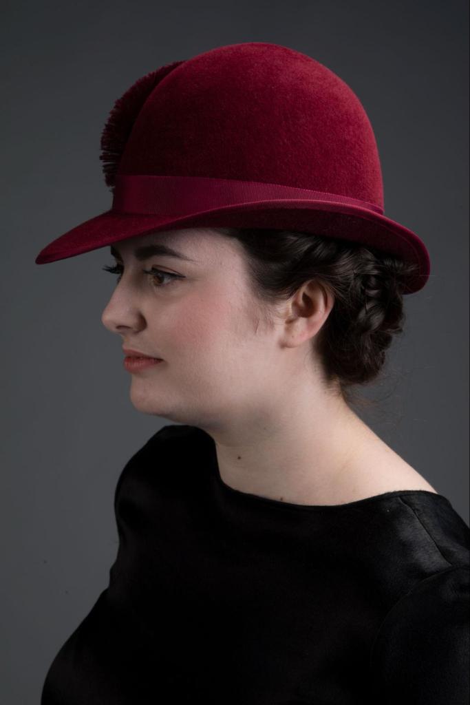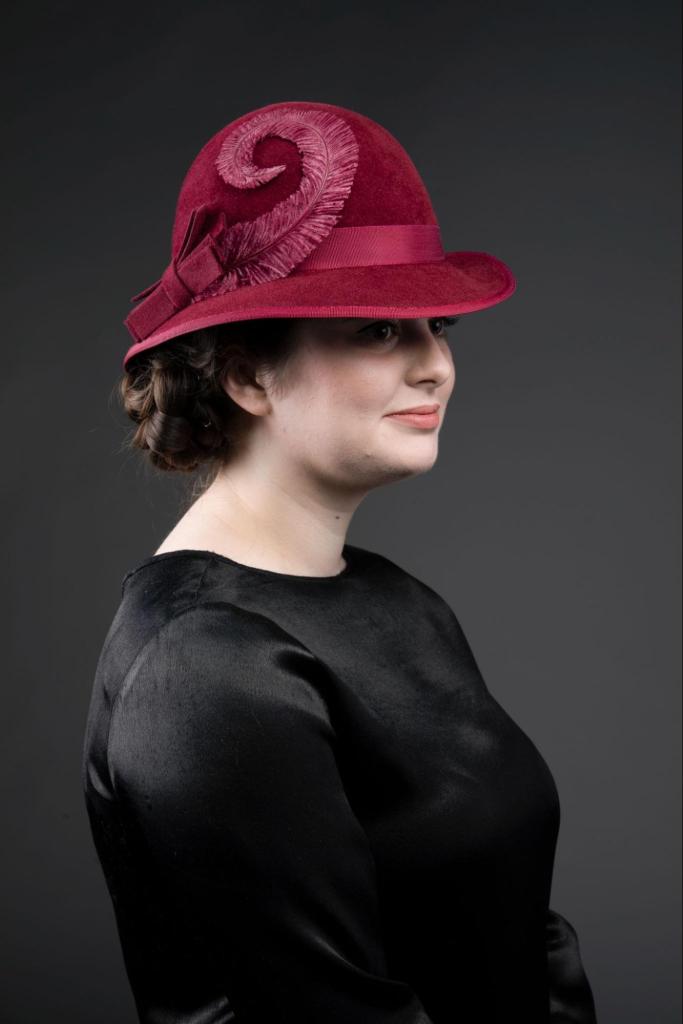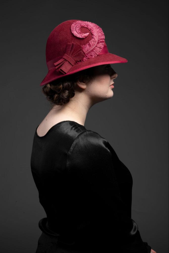 An interpretation of Mary Crawley’s hat from Downton Abbey. This hat was constructed using rabbit fur felt, moulded using steam and decorated with cut felt and a hand curled feather.