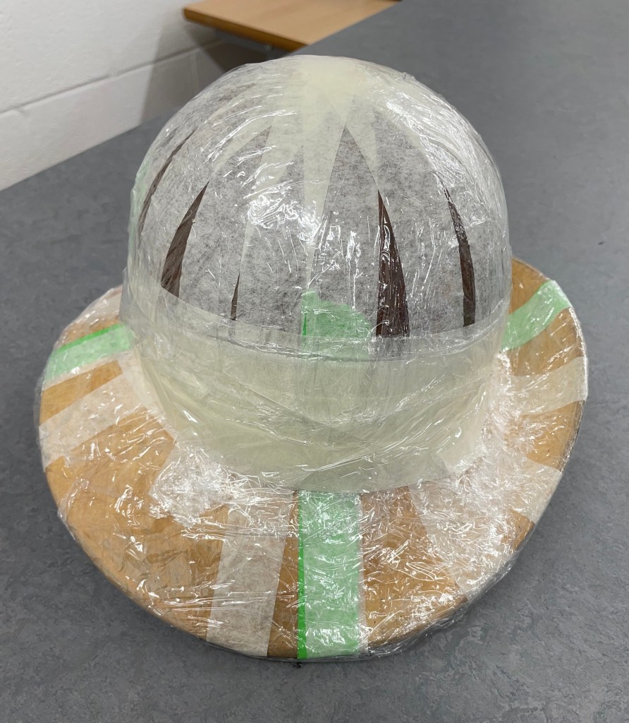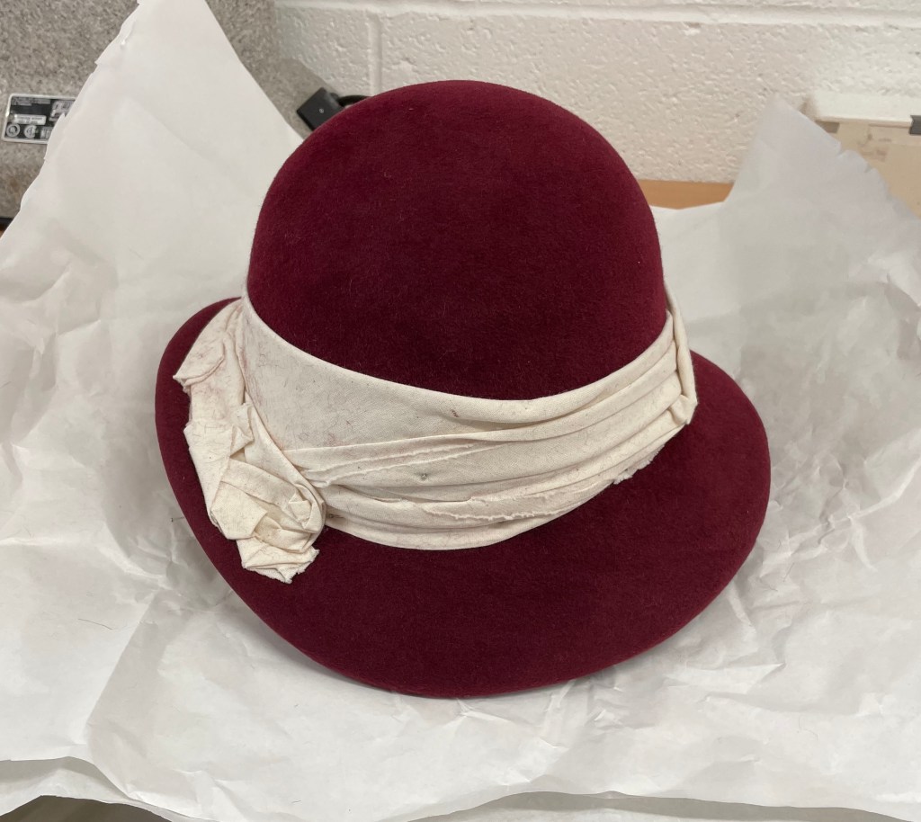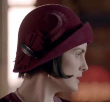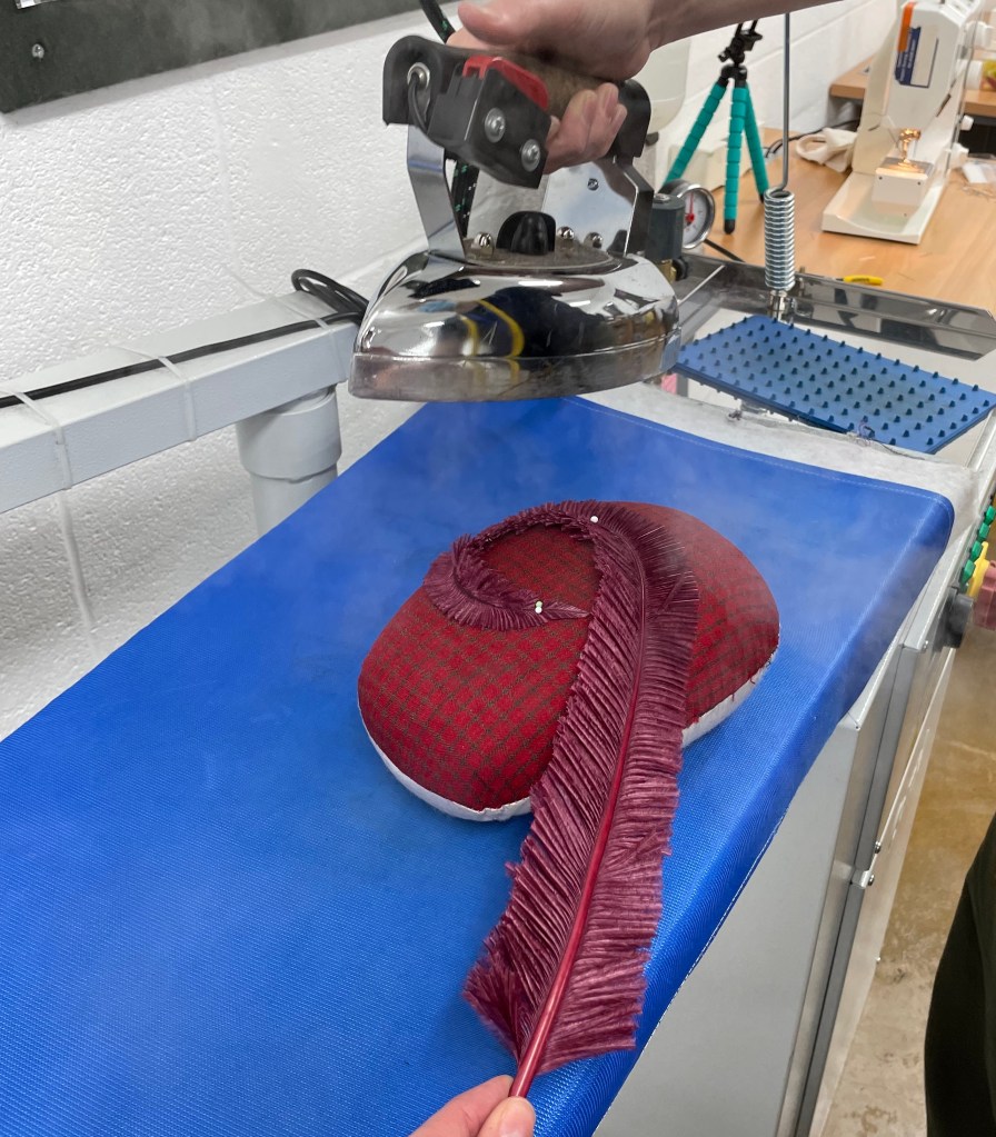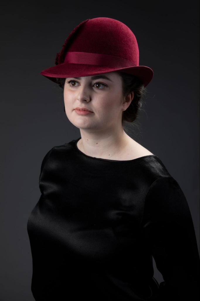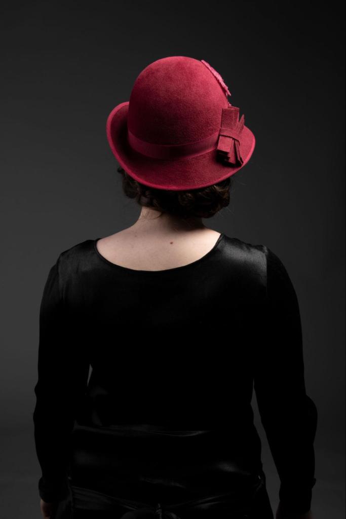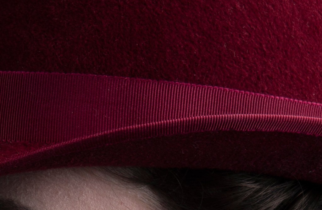 An interpretation of Mary Crawley’s hat from Downton Abbey. This hat was constructed using rabbit fur felt, moulded using steam and decorated with cut felt and a hand curled feather.