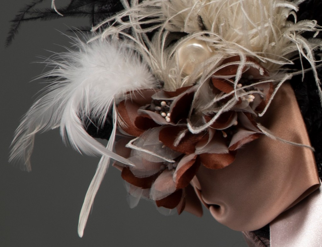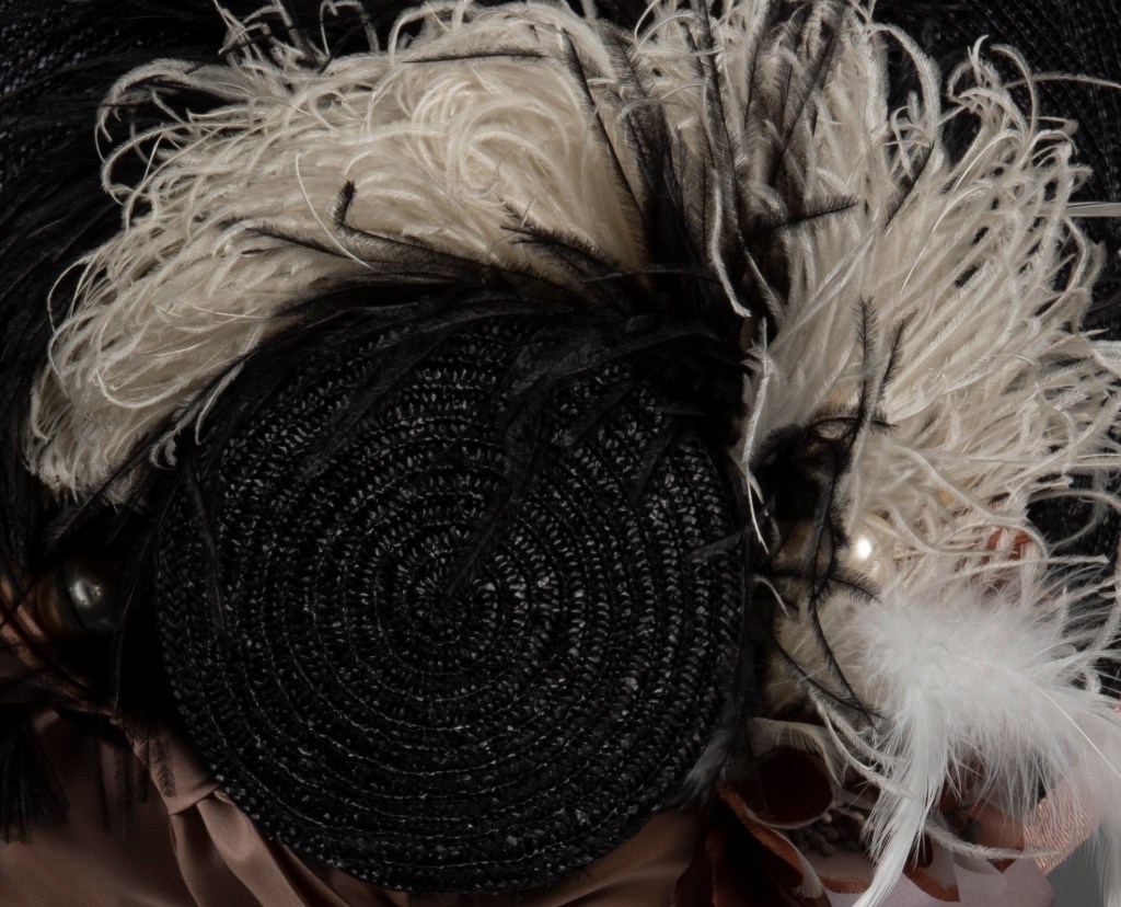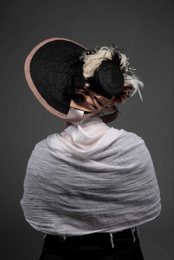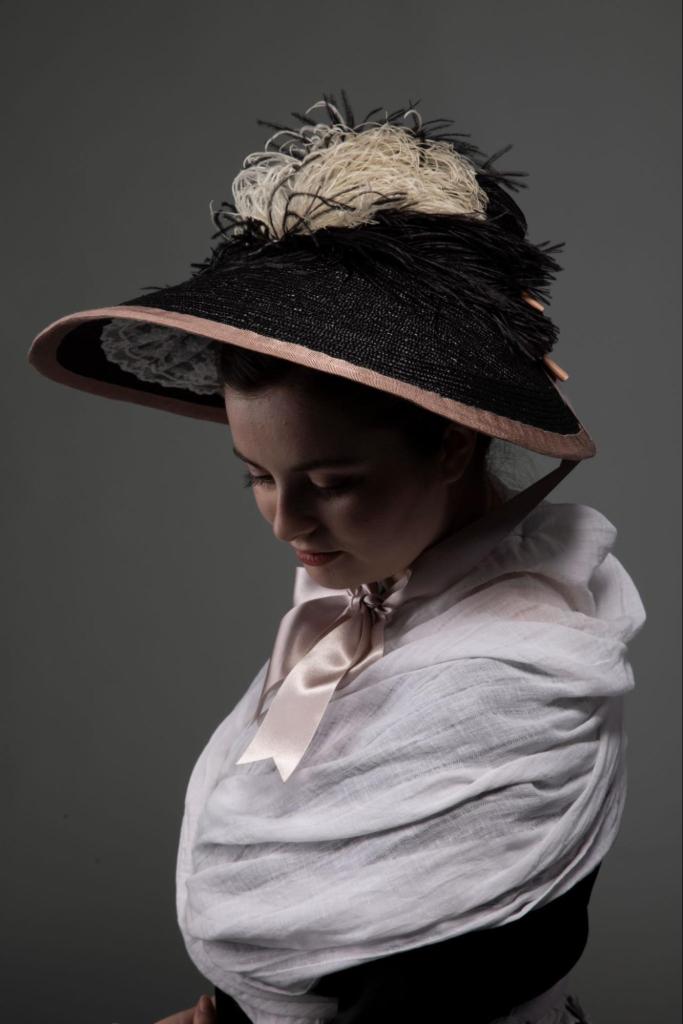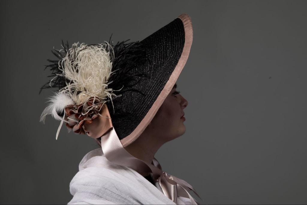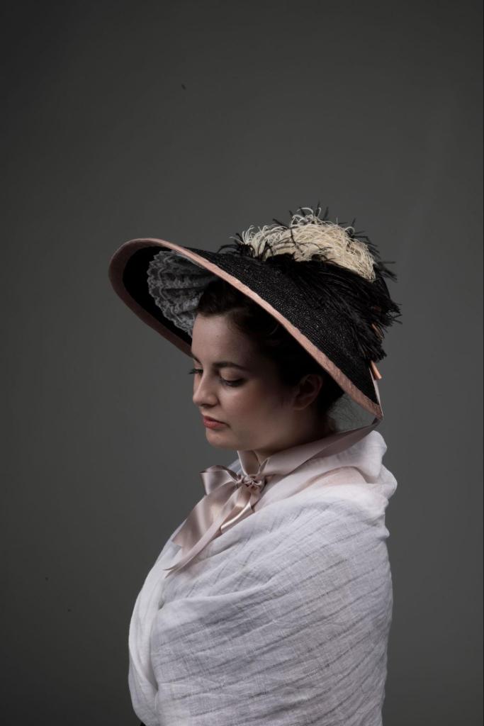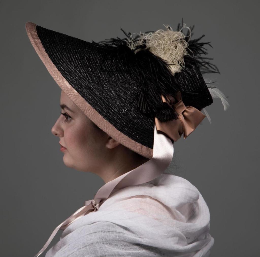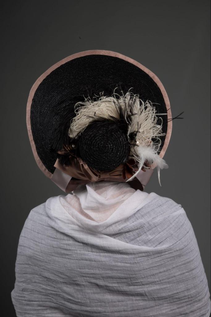 An interpretation of Harriet’s bonnet from the film production Emma. Constructed by stitching strip straw, over a buckram base and lined with silk. The bonnet has been decorated with handmade bows, hand curled feathers, ribbons and delicate vintage flowers.