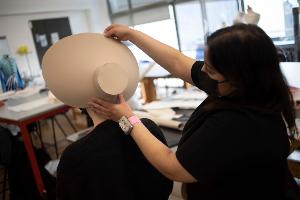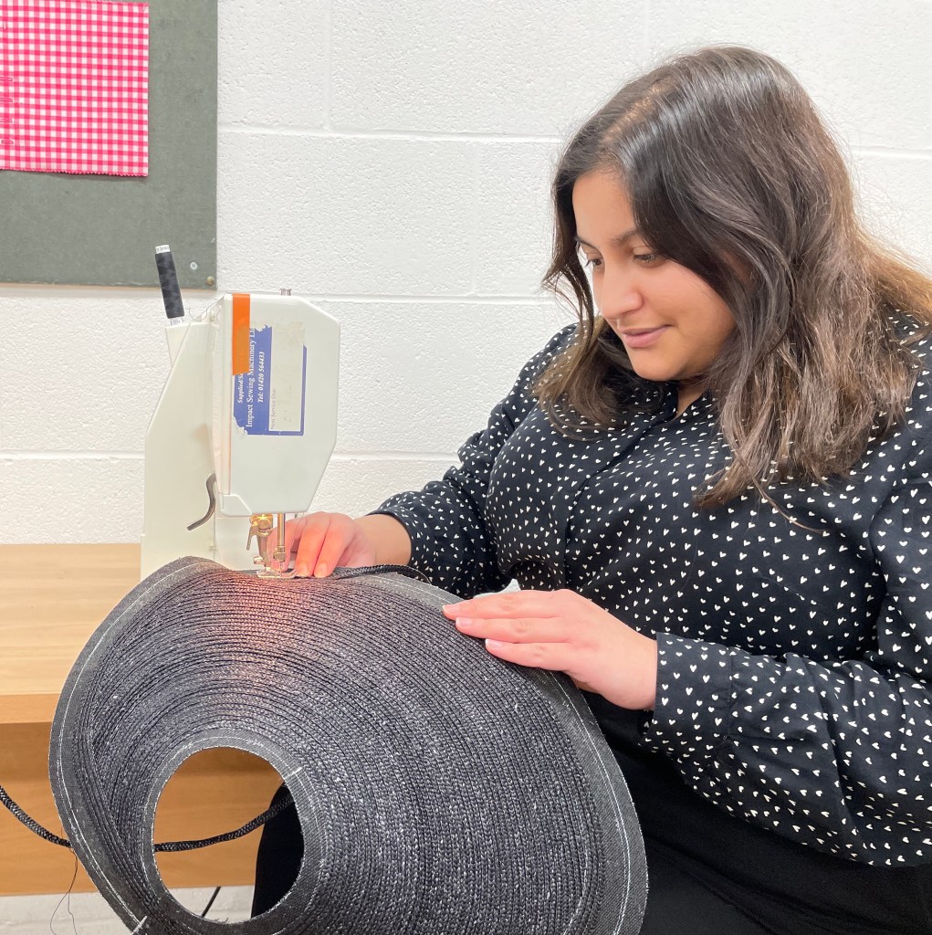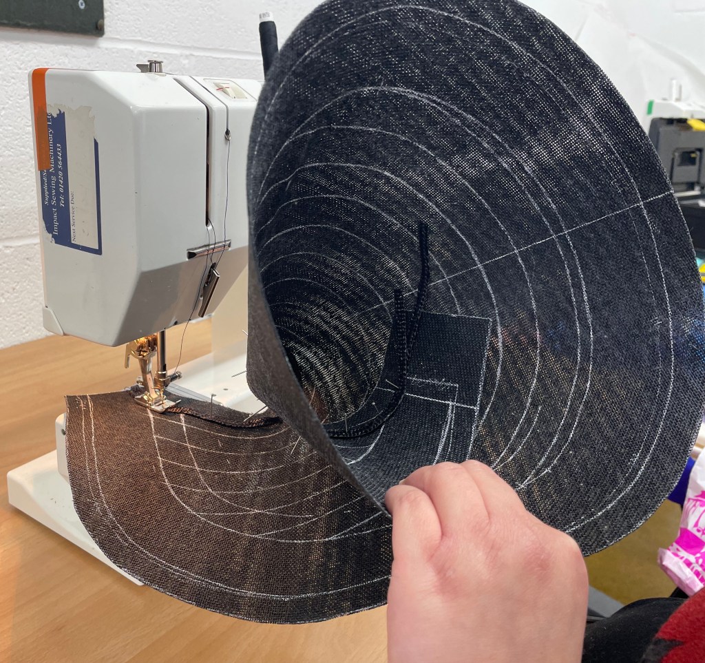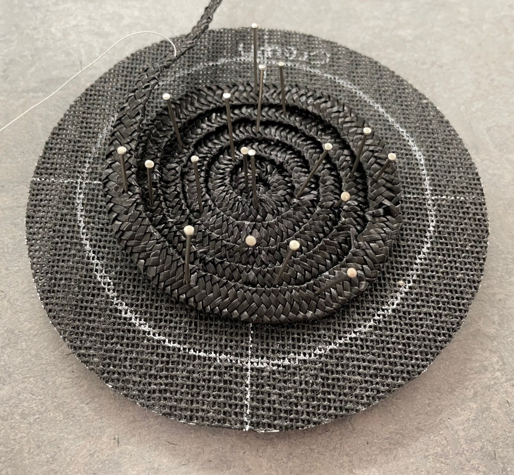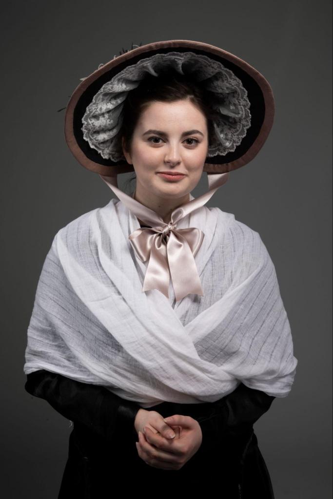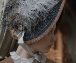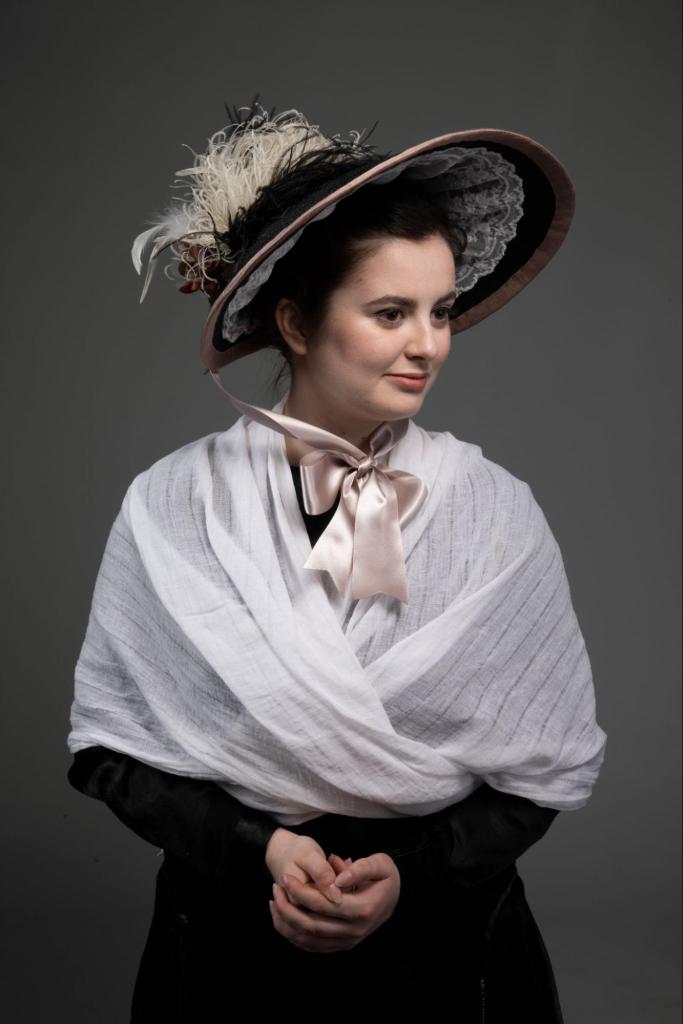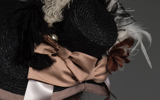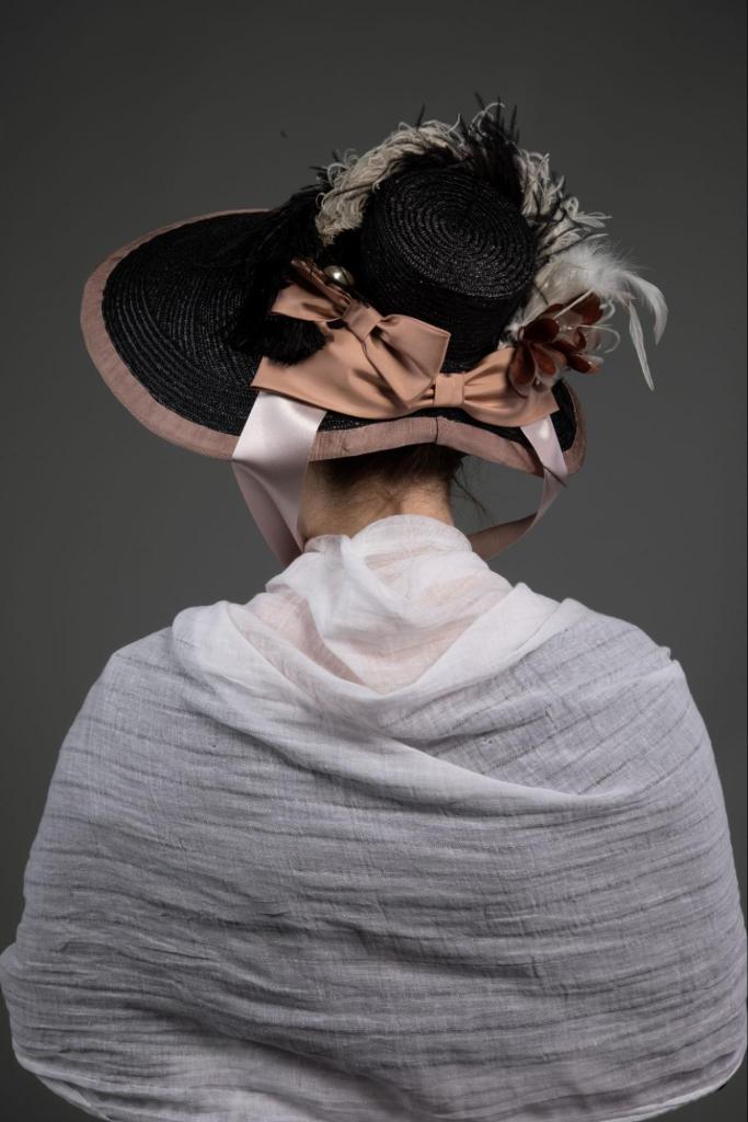 An interpretation of Harriet’s bonnet from the film production Emma. Constructed by stitching strip straw, over a buckram base and lined with silk. The bonnet has been decorated with handmade bows, hand curled feathers, ribbons and delicate vintage flowers.